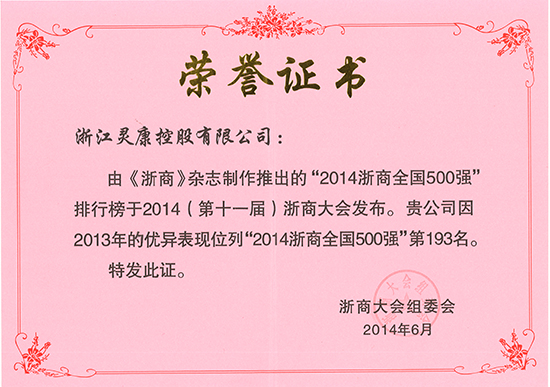 浙江博天堂控股有限公司荣膺2014年浙商全国500强第193位