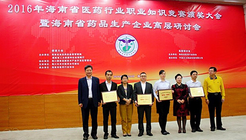 2 0 1 6 年1 1 月2 4 日, 由海南省食品药品监督管理局、海南省人力资源和社会保障厅主办, 海南省医药行业协会承办的“2 0 1 6年海南省医药行业职业知识竞赛颁奖大会暨海南省药品生产企业高层研讨会“ 在海口召开, 海南各药品生产企业、药品经营企业代表及获奖人员出席会议。